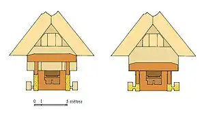 The complex shares many similarities with other complexes, such as the pyramid of Khendjer, the Northern Mazghuna pyramid, and to a lesser extent the pyramid of Ameny Qemau (mainly in having a second sarcophagus).[1][2][5] However, none of the objects recovered from the complex provides the name of its owner, although construction management labels were found that refer to regnal years 3 to 5. A fragmentary inscription found within the pyramid reads "Weserkha..." that might refer to the Golden Horus name Weserkhau of king Djehuti, suggesting that he could have been the pyramid owner.[3]
