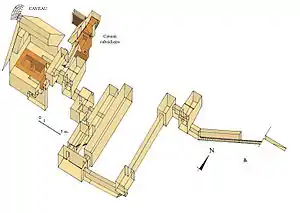 The entrance to the second, smaller sarcophagus chamber is on the north side of the fork-hallway, and is laid out as two separate parts. The purpose of the chamber is unclear: It may have been intended for a queen consort, or for the king's ka, a co-regnal sibling of the pharaoh, or maybe simply a false burial chamber intended to confuse grave robbers.[1] The two parts of the second sarcophagus chamber were designed to be separated by a fourth and last portcullis, still open. It is peculiar for having the order of the “antechamber” and the sarcophagus-vault swapped: The sarcophagus-vault is entered before what would customarily be the “antechamber”, which holds the lid of the sarcophagus and would have been sealed off by the wall formed by the portcullis, once in place.[2] This strange layout is also unexplained, perhaps reflecting some unknown reason of religion or tradition.