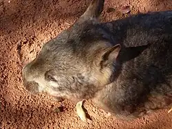 The southern hairy-nosed wombat is adapted to digging; it has a stocky and robust build, flattened claws, and five digits.[8] It is also plantigrade. The body length ranges from 772 to 934 mm (30.4 to 36.8 in) with a body mass ranging from 19 to 32 kg (42 to 71 lb).[8] Its short tail is hidden by its fur. The pelage is silky and is typically greyish or tan in colour. The wombat grooms itself with its second and third toes, which are fused together, except at the tips.[9][10] The head is robust and flattened and the ears are pointed.[11] The snout resembles that of a pig.[9] The animal gets its name from the hairs that cover its rhinarium.[8] The wombat's incisors resemble those of rodents, and its molars are widely spaced by the palate.[9] The teeth keep growing for the entirety of the animal's life, which is likely an adaptation to its harsh diet.[8] Compared to the common wombat, the southern hairy-nosed wombat has a larger temporalis muscle and a smaller masseter muscle.[12] Also, unlike the northern hairy-nosed wombat, the southern hairy-nosed wombat's nasal bone is longer than the frontal bone.[8]