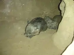 Southern hairy-nosed wombats dig and live in burrows which they connect into warrens with many entrances. These warrens are their prime refuges and are shared by up to 10 individuals.[13] A wombat digs with its fore claws while sitting up.[21] It leaves its new burrow backwards and pushes out soil with all its paws.[21] The central warren is surrounded by a circle of small, simple burrows 100–150 m from it.[19] The small burrows along the outer edges is where young wombats go when they are displaced from the central warren.[13] Wombats may favour a certain burrow and not share it with others. However, there is no monopolization of burrows.[22] Wombats move between burrows and even warrens. Male wombats are territorial towards wombats from other warrens, possibly to defend food resources and the warren refuges.[13] Trails of droppings connect the burrows. The males also mark their territory with anal scent secretions by rubbing their backs and rumps on objects.[9] Fights between males over territories or mates do occur and involve bites to the ears, flanks, or rumps.[8] Also, a dominance hierarchy exists among males.[8]