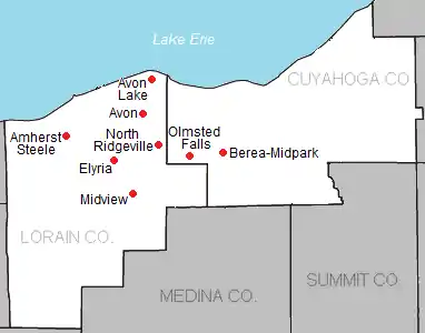 ElyriaNorth RidgevilleGraftonLakewoodAvonBereaBroadview HeightsAvon LakeWestlakeOlmsted FallsNorth OlmstedBay VillageMedinaAmherstWellingtonLorainFairview ParkRocky RiverOberlinBerea