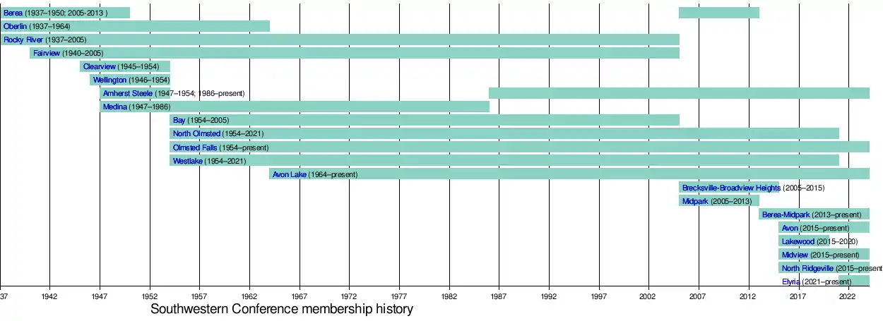 • Avon High School was approved to join the SWC in 2015-16 to accommodate the Berea-Midpark merger.[6]