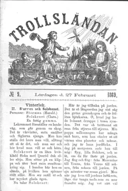 Topelius is considered to be the first author of Swedish-language literature specifically intended for children. From the 1840s till his death he wrote some 230 poems, songs, stories and fairy tales. He was also the first in Scandinavia to write plays for children. He appeared widely, including in Trollsländan, with columns under the heading Vinterlek ("Winter play"). He intended the pieces he wrote to become a part of children's play, not to be used as theatrical performances.[2]