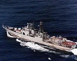 On 1 March 1985, Admiral Spiridonov joined the 183rd Anti-Submarine Warfare Brigade.[8] Between 21 August and 22 November 1985, the vessel sailed from Liepāja to Vladivostok to join the Pacific Fleet with Admiral Nakhimov, Frunze and Osmotritelnyy, visiting Luanda, Angola, Maputo, Mozambique, Aden, South Yemen and Cam Ranh Bay, Vietnam, along the way.[9] On 16 June 1986, the vessel joined exercises in the Sea of Japan followed by a visit to Wonsan, North Korea, and then operations in the Indian Ocean and Persian Gulf between 1989 and 1991.[10]