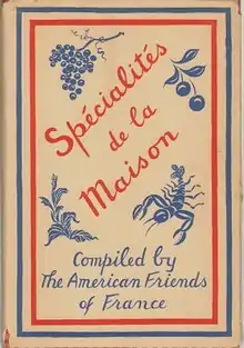 Spécialités de la Maison is a cookbook containing more than 200 recipes by a wide array of early 20th Century celebrities and socialites. The book was originally published in 1940 under the direction of Anne Morgan in order to raise funds for her nonprofit organization, the American Friends of France, which sought to bring relief to the French population in wartime.[1] Reprinted in 1949, Spécialités de la Maison includes recipes by Salvador Dalí, Christian Dior, Katharine Hepburn, Charlie Chaplin, and Helen Keller.[2]