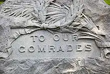 On the front of the memorial are carved in bas-relief several palm branches, which lean to the left and shade the panel below. A laurel wreath lies atop the palm branches. The wreath has a bow at its base. One of the long, trailing ribbons of stone appears to be loosely draped over the right side of the panel, where it wraps around the base of the palm fronds. The other trailing ribbon appears to be loosely draped to the left of the panel. The wreath, fronds, and ribbon partially obscured the top, upper left corner, and upper right corner of the panel. Below the wreath and fronds is a sunk panel with inscription "To Our Comrades".[31]