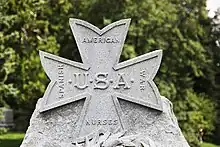 The memorial consists of a single rough-hewn, grey granite boulder approximately 6 feet (1.8 m) wide, 3.5 feet (1.1 m) across, and 7 feet (2.1 m) high.[31][33] At the top of the memorial in solid granite is a Maltese cross, the insignia of the Order of the Spanish–American War Nurses.[36] The insignia is on both the front and rear of the memorial.