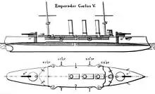 Emperador Carlos V was built at the naval shipyard at Cadiz, Spain, the largest ship built in Spanish yards in this era.[1] She was laid down in 1892, launched on 13 March 1895, and completed on 2 June 1898. She was the only member of her class. Her boilers and machinery were of Spanish construction, her armor German, her stern and stern post British, and her gun turrets, which were installed at Le Havre, France, in 1897, were French.[1] She had three funnels and was weakly armored, relying mostly on her armored deck for protection. Her 11-inch (280 mm) main guns were mounted fore and aft in centerline hooded barbettes.[2] One of her strengths was considered to be her great steaming range.[3]