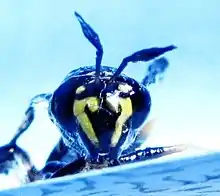 The face is long, flat, black with varying yellow marks.It is yellow in the middle with a large black arrowhead shaped spot and the broadly rounded apex rests on the oral margin and its base and is narrowly connected with the broad black field below the antennae. This black field extends transversely to the orbit of the eye, separating the yellow of the face and from a small yellow somewhat triangular spot situated at the orbit of the eye and opposite the base of antennae. From the antennal process to the middle of the arrowhead shaped spot there is a yellowish line, very narrow above, widening below. Some have either a few yellow spots or a transverse stripe below antenna base. Above the base either a yellow V-shaped stripe (usually on male), or another series of 4 spots (usually on female). The front is black, broadly connected with the black below the antennae. A little below the middle are two small, narrowly separated, reddish brown, transverse spots. The opaque portion of the front is thinly white pollinose, and can be seen only in certain lights, most conspicuously at the orbit of the eye. The gena is broadly black with an abbreviated yellow stripe from the inferior orbit of the eye. The eyes of male are touching at top before ocelli while the female eyes are wide apart. The ocelli are reddish-brown, raised above top of head with two, nearly touching spots of yellow behind the ocelli. Another faint, hard to see, brownish-yellow spot is at the bottom of eye. The antenna are very long, black with a brownish-yellow base. The scape is slender with the basal two-thirds reddish brown and scarcely longer than the flagellum. The pedicel is black and half as long as the scape. The flagellum is wider with tips sharply pointed. The antennifer, the base for the antennae, is very little projecting above and wholly obsolete below and brownish yellow. Behind the ocelli are two yellow dots placed in a transverse line. The vertex is reddish brown with the sides of front below thinly provided with yellowish pile. The occiput is black, thinly white pilose and white pollinose, the latter conspicuous only along the orbit of the eye.