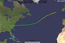 SNOX IV was the most successful flight to date, launched on March 11, 2008, it remained in the air for over 40 hours and 5,600 kilometers (3,500 mi), surpassing all flight duration and distance records for amateur balloons.[1] The ballast system used all available weight on the first night, and the balloon system succumbed to the loss of solar heat on the second sunset of its flight. The landing was just a few hundred kilometers from Ireland.