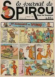 Spirou (French: Le Journal de Spirou) is a weekly Franco-Belgian comics magazine[lower-alpha 1] published by the Dupuis company since April 21, 1938. It's an anthology magazine with new features appearing regularly, containing a mix of short humor strips and serialized features, of which the most popular series would be collected as albums by Dupuis afterwards.