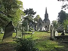 The church and chapel are Grade II listed,[3] but are no longer used for burial services. The chapel has two attractive spires, one in the form of an obelisk and the other a broach spire above the entrance porch. It is in a poor state of repair with deteriorating masonry and water penetration exacerbated by lead theft from the valleys in the roof. Take a stroll around the old graves and read the head stones some of them make fascinating reading, some very sad. Also be very careful, you will find a lot of head stones laid down this is because they have become unstable in the 100 or so years they have been there, also respect the graves, keep pets on a lead whilst in the cemetery, dotted around the cemetery are bins for you to put your pets waste in. At the bottom of the cemetery to the right of the bottom entrance near the Lodge is still an active burial ground for residents who have past.