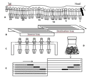 The stringed crowns and the trays used in manual sorting are shown in the figure. The destination tray is moved step by step in the direction of the arrow. The crowns are transferred in groups from the slots of the source tray into the all opposite slots of the destination tray. The transfers are directed by computer and the products are identified by the positions of the crowns occupied on the final strings. A fast automatic sorter machine had also been described.[30] The sorter is outlined in the figure. It has two sets of aligned tubes. The lower ones are step by step moving in the direction showed by the arrow and the coin-like units are dropped from the upper source tubes into the lower destination ones. The tubes may serve as reaction vessels too. A software had also been developed that can direct sorting if not a full combinatorial library is synthesized only a set of its components are prepared that are picked out from the full library.[31]