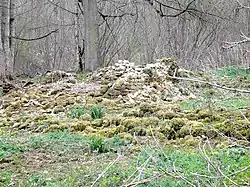 Structural remains had been noticed in the wood before 1877, but it was only in 1882 that workmen, searching for stone, uncovered one of the rooms of the villa.[4] The site was in the ownership of Emma Dent, the owner of nearby Sudeley Castle, who had a mosaic lifted and moved to the castle.[5] The site was subsequently excavated by the antiquarians John Henry Middleton and William Bazeley.[4] For two years the site lay open, during which time it was damaged by frost, rabbits, and visitors.[5] In response to the damage, Emma Dent chose to partially rebuild the walls, up to 1.8 metres high in places on the east and south sides, and to reconstruct two of the remaining mosaics and cover them with wooden sheds.[4] The huts had become ruinous by 1945,[1] and in 1976 it was reported that "the sheds have now collapsed and the remains are suffering from weather and from the encroaching wood."[4]