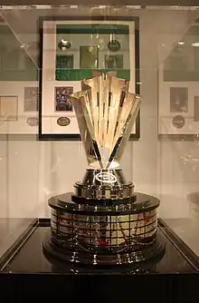 The trophy is 24 inches (61 cm) tall and weighs 27 pounds (12 kg).[1] It was designed in 2003 by Bruce Newman[2] and was first awarded in 2004 to series champion Kurt Busch and the last one being awarded to Jimmie Johnson in 2016.