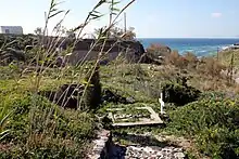 Marinatos was removed from the leadership of the Archaeological Service on 31 January 1974.[69] No official reason was given for the dismissal, though the general Dimitrios Ioannidis, who had taken power in a coup of November 1973, considered him a potentially subversive "liberal".[70] On 1 October 1974, Marinatos died while excavating at Akrotiri.[71] Contemporary accounts related that he had died from a fall, while giving instructions to a worker;[23] a later narrative emerged that he had been struck by a collapsing wall.[72] At the time of his death, most of his excavations were not fully published.[6] He was initially buried on the excavation site, near the place of his death;[7] his grave was subsequently moved outside the ruins.[65] Marinatos's deputy Christos Doumas, who had worked with him at Akrotiri since 1968, took over the site and published the first full report of its excavation in 1983.[73]