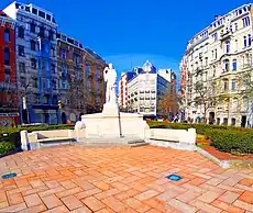 From the outset, the square was embellished with a triangular parterre on the boulevard's side, which in 1924 welcomed the Monument to the Showmen who died for the Fatherland. In 2005–06, the space was redesigned as a pedestrian area, with the exception of the western end, where a carriageway connects the Rue Lambert Crickx and the Rue de l'Autonomie. The narrow part of the square now houses a fountain.[1]
