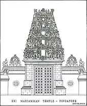 The original three-tiered gopuram (entrance tower) was constructed in 1903. It was slimmer and less richly embellished than the current tower. The sides of the tower also appeared to be more stepped than sloping. Nonetheless, it had an iconic presence in Chinatown, and was a widely recognised landmark. The present six-tiered gopuram was built in 1925. It was repaired and restored with an elaborate proliferation of sculptures in the 1960s.