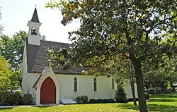 A small Carpenter Gothic-style board-and-batten structure constructed in 1878, it divided into two principal parts: a large rectangular sanctuary three bays long and two bays wide with a steeply pitched gable roof, and a slightly smaller but similarly proportioned chancel, two bays long and one bay wide. The entry features a wide Gothic-arched double doorway with a steep gable roof. The sanctuary has a pair of stained glass lancet windows on the first floor, and a circular stained glass rose window in the upper gable.[3]
