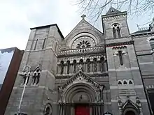 St. Ann's original façade was never completed above the first floor. In 1868, a competition was held for a new façade, with the architectural firm of Lanyon, Lynn & Lanyon losing the commission to the Deanes, Thomas Newenham Deane and his father. The younger Deane, who had been involved with the creation of significant buildings at Oxford University, designed a neo-Romanesque front.[6] Described by one travel guide as "amazingly ornate,"[7] the façade as it exists in the 21st century lacks some elements of Deane's original conception, most significantly the tallest tower; the design as Deane submitted it can be viewed online. From an architectural perspective, this omission has been criticised as disrupting the building's flow from the rectory to the spire.[8]
