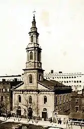 The parish was established in 1852 by Bishop Hughes, who appointed Rev. John Murray Forbes as its first pastor.[2] The parish began on Bond Street in the Lower East Side, but soon moved to a church building at East 8th Street at the north end of Lafayette Place, now Lafayette Street. That building had been constructed in 1811–12 on Murray Street by the Third Associate Reformed Presbyterian Church, and was designed by John McComb Jr. in the Georgian style; it was later moved by the Associate Reformed Presbyterian congregation to the 8th Street location. When that congregation moved uptown, the building was sold to the new Roman Catholic parish.[3]