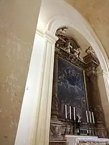 The painting on the main altar is not of high artistic quality,[30] however it replaces another prestigious painting of the martyrdom of St. Catherine - now housed at the Żejtun Parish Museum - which is attributed to the Maltese painter Cassarino, in imitation of Caravaggio.[31] This latter painting returns striking similarities with the Beheading of Saint John the Baptist and other famous paintings by Caravaggio.[30] The titular painting rests in a stone framework, with a statue on each side. On the left, there is a statue of St. Catherine, while on the right one of St. Euphemia. These statues used to adorn the Cappella d'Italia at Saint John's Co-Cathedral, and were placed in Żejtun once they were replaced by marble statues.[30]