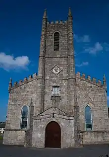 The modern church was designed by local architect James Sheane, whose name is inscribed on a datestone in the tower and who was buried in the churchyard upon his death in 1816.[5] A porch was later added by John Bowden. The church was restored in 1879 by Thomas Newenham Deane.[6] The original construction was funded by the Board of First Fruits with a gift of £100 and a loan of £775.[7]