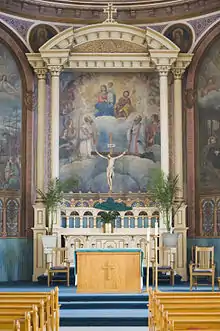 When the church was built in 1892, it became the largest church in Montana. It is a cruciform church in the Romanesque Revival style. The arches over the windows and doors are semicircular, and there are smaller arches along the eave line, small buttresses, and a bell tower. Jesuit lay brother Joseph Carignano (1853–1919), who also painted the frescoes at St. Ignatius Mission, painted the interior. The church also has stained glass windows, a pipe organ, and a 2,270 pound church bell dedicated to Jesuit missionary Father Lawrence Palladino.[3]
