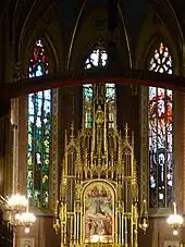 The Franciscan Basilica is in possession of the certified copy of the Shroud of Turin, located in the Chapel of the Passion. It is placed at the main altar of the chapel (pictured) for all guest and parishioners to examine. The replica was consecrated by Pope John Paul II at the Vatican on 19 March 2003; and the ceremonial unveiling by Cardinal Franciszek Macharski of Kraków took place on 14 April 2003.[6]