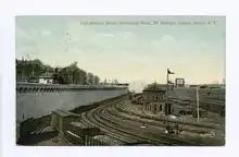 The Staten Island Tunnel, a railroad/rapid transit tunnel to Brooklyn, was proposed in 1912 in conjunction with the Dual Contracts of the New York City Subway.[50][66] It was hoped that the completion of the tunnel would spur the development of inner Staten Island and St. George, as a trip to Manhattan via the tunnel was expected to take only 12 to 15 minutes, compared to 25 on the ferry.[65] However, after several delays and a groundbreaking in 1923, the project was canceled in 1925.[50][67][68] Another plan for an expanded ferry terminal with a 26-story office complex was proposed in 1930, but never built.[69]
