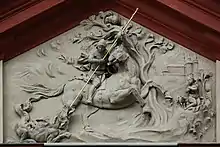 With the exception of some elements of the façade, and interior of the church, the basilica has maintained the Romanesque style from the restoration after the fire in Prague Castle in 1142.[4] A bas-relief on the outside of the building represents Saint George and the dragon.[10]