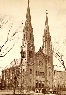 The architects of the new church were Charles Otto Blesch and Leopold Eidlitz. The exterior design, attributed to Blesch, was influenced by the Rundbogenstil (round-arch style) Ludwigskirche in Munich and the plain hall churches of Germany. Eidlitz designed the interior spaces.[6] He also designed the rectory—also known as the Henry Hill Pierce House—which was built in the early 1850s.[1] The spires on each tower of the church were completed almost a decade after the remainder of the building.