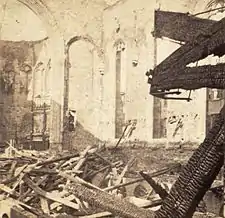 The church was gutted by fire in 1865,[9][11] and was rebuilt within the next two years[9] under the supervision of Eidlitz.[1][6] The pastor of St. George's at the time of the reconstruction was Stephen H. Tyng, who was a leader in the evangelical wing of the Episcopal Church, and considered to be one of the most notable preachers of the time.[6] Under his instructions, the interior of the rebuilt church reflected his views: the altar, for instance, was a plain table.[9]