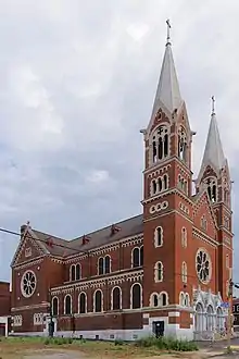 St. George Church, also known as St. John Vianney Church, is a former Roman Catholic parish church in the Allentown neighborhood of Pittsburgh, Pennsylvania. The church was designed by Herman J. Lang in the German Romanesque and Rundbogenstil architectural styles, was built in 1910-1912, and today functions as a community space. The church was nominated in January 2016 to become a City Historic Landmark by Preservation Pittsburgh, but the nomination was placed on hold pending an appeal of the closure of the church.[1]