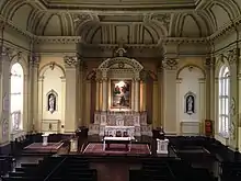 Major renovations were carried out in 1870, the transparent glass windows replaced with new stained glass. New pews to seat about six hundred people were added. A ceiling painting of the Assumption of Mary by Wilhelm Lamprecht was added. The following year, the newly renovated church was decorated for the public celebration of the twenty-fifth anniversary of Pius IX's election to the papacy; gaslight illuminations were installed for the occasion but could not be used because of adverse weather.[4]