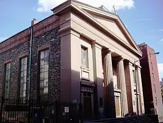 St. James' Roman Catholic Church is located at 32 James Street between St. James Place and Madison Street in the Two Bridges neighborhood of Lower Manhattan, New York City.[3] It is the second oldest Roman Catholic building in the city, built in 1835–1837 of fieldstone, with a pair of Doric columns flanking the entrance.[1] While the neo-classical church is modeled on the published designs by Minard Lefever, and is sometimes attributed to him, there is no hard evidence of this being true.[1][4] The building was once topped by a domed cupola.[4]