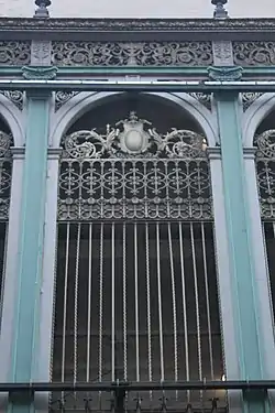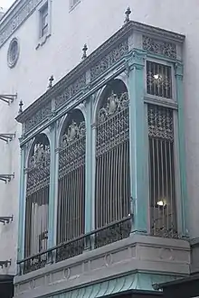 The 44th Street facade has quoins at the extreme west and east ends on the upper stories.[19] The center of the facade has a projecting double-height loggia of wrought iron, which conceals the fire escape.[5][9][14] The bottom of the loggia contains stone panels, beneath which is a metal base that curves onto the marquee below it. The loggia has three arches are separated by Ionic-style columns. The arches contain wrought-iron grilles, above which are cartouches flanked by foliate decoration. The spandrels above the arches' corners contain wrought-iron foliate decoration and winged animals. A wrought-iron frieze runs above the loggia, and finials are placed on the loggia's roof. On either side of the loggia are two vertical signs with the letters "St. James", which face west and east. These signs have corbels at their bottoms and lanterns on top.[19] At the time of the theater's construction, one observer said that the blank facade was "most appropriate" for the backdrop of an electric sign.[17][20]