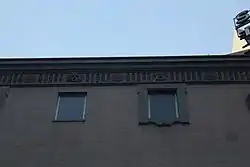 The attic has five rectangular windows between two circular windows.[5] Three of the rectangular windows have decorative surrounds that are scrolled at the bottom and eared at the top; they alternate with the other two windows, which have no surrounds. The two circular windows contain surrounds with foliate ornament. The attic is topped by a frieze with circular bellflower decorations, vertical niches, and masks depicting comedy and tragedy. Above that is the cornice, which is simple in design. The cornice, frieze, and quoins are also visible on the eastern wall (facing the Hayes Theater).[19]