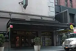 The ground story has numerous recessed doorways.[10] The doorway at the far west (on the right, as viewed from the front) is a metal stage door.[10][12] The entrance to the box office lobby is immediately adjacent to the stage door.[12][16] The lobby entrance consists of three aluminum and glass double doors, above which is a transom panel with signs.[16] East of the lobby entrance is a sign board, as well as a service door accessed by two granite steps. The center of the ground-story facade has four metal doors from the auditorium. The eastern section has a glass-and-metal double door to Jujamcyn's upper-story offices, as well as additional service doors. A pair of marquees, with signs facing west and east, is suspended above the western and central sections of the facade.[lower-alpha 1] A stone band course runs above the base.[19]