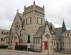 Construction of the present church began in 1875 and it was completed three years later. The church was designed in the High Victorian Gothic style by New York architect Henry M. Congdon. The rough-cut limestone for the walls was quarried in nearby Farley, Iowa.[4] The church follows a cross-shaped plan. It features a crenelated corner tower, recessed entryways, a rose window, roof dormers, and a shorter tower toward the back of the church that is capped by a spire. The larger tower was also designed to have an upper tower and a spire, but they were never built.[5] Five of the stained glass windows are from Louis Comfort Tiffany's studio.