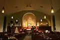 The interior of the nave is covered by a barrel-vaulted ceiling and is lit by five large stained glass windows on each side. The chancel dado is paneled and covered by a rib vaulted ceiling over the three-sided apse. The vaults are decorated by frescoes. The first and third panels of the apse are covered with mosaic panels, framing the central panel which contains a stained glass window.[7]