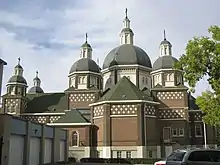 St. Josaphat Cathedral is a Ukrainian Catholic cathedral in McCauley, Edmonton, Alberta, one of the best examples of Byzantine Rite church architecture in Canada. It is the seat of the Ukrainian Catholic Eparchy of Edmonton, and has been a cathedral (the seat of a bishop) since 1948. Occupying 18 city lots in the McCauley neighbourhood, the cathedral has been recognized for its heritage significance and "is distinguished by it seven domes, columned entry portico, and red brick veneer embellished with darker brick pilasters and inlaid cream coloured crosses.[2]
