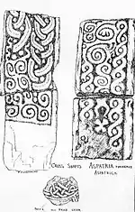 There are two shafts belonging to two spiral crosses, both are carved from white sandstone and each in two parts. One is 1.15 metres high and 40 centimetres wide. The top piece has plait-work in sham double strands; with bosses in every available place. The bottom piece holds a carved swastika. The two parts of the other slab are together 92 centimetres high and 38 centimetres wide and 15 centimetres thick. There is evidently a portion missing between the two. Two broad lateral bands passing round bosses, haze a central scroll at the top, whilst in the lower part are the body and legs of a man, with the swastika below. This has been taken as representing the crucifixion of Jesus. In all there are nine slabs in the vestry.[14]