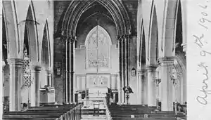 The church is in the early English style and finished in the manner of a Victorian town church. It consists of a nave, side aisles, chapel, chancel, south facing porch, vestry, and western tower, surmounted with parapets and pinnacles. The building is constructed from local red sandstone, with a roof made with Cumberland slate. The architects for the new church were Messrs. Travis and Mangnall, who preserved the chief architectural features of the old church and incorporated them into the design of the new building. The builders were Messrs. McKay and Blackstock.[5] The designers reconstructed the Norman doorway which they used as the entrance to the vestry, placing another in the base of the tower. In the west end of the church, between the vestry and the tower they retained the old chancel arch, which is a fine example of what is called a dog-tooth type of decoration. They also retained and restored the Musgrave chapel. The tower is square and has a higher-stair turret at its north-east corner. The nave is lofty with six-bay arcades and small clerestory. The whole is beautifully proportioned with a high roof full of light.[6]