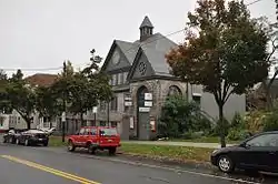 The local Congregationalists organized in the neighborhood 1854 to build St. Lawrence Chapel. Having outgrown that facility, the church was erected in 1897 to a design by New York City architect Arthur Jennings. The building was unique within the state for its combination of Richardsonian Romanesque and French Chateau elements.[2] Maintenance suffered as the congregation dwindled in later years due to increasing costs and demographic changes; the church was added to the National Register of Historic Places in an effort to help preserve it. The congregation eventually dissolved itself in 1986 and de-consecrated the building.[3]
