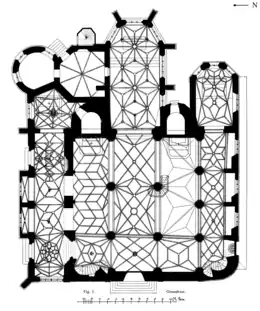 The church began as a Romanesque style basilica 1219, built in the centre of the town close to the river Main. It is dedicated to St. Leonhard. It featured twin steeples and a richly decorated portal to the north.[1] The church was remodelled c. 1425 with a late Gothic choir, possibly after a design by Madern Gerthener, with extant balconies and stained-glass windows from c. 1435.[2] The church was expanded to a hall church in late Gothic style with four aisles between 1508 and 1520.[1][2] A chapel in the south was added by H. Baltz c. 1515.[1][3] In 1792, French troops occupied the building, used it for storage, and sold much of its furniture.[4]