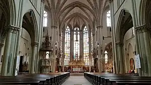 Today's provost church was built in the years 1892–1898 on the foundations of the Romanesque Ludger Church and a funeral chapel erected around 1735 by master builder Wilhelm Rincklake (1851–1927). He designed the nave in the form of a basilica with a transept and the 100 m high pair of towers[1] from the Baumberger sandstone found in the nearby Baumberge. The towers of the cathedral can be seen from afar.
