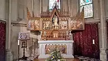 Both side altars were designed by the architect Wilhelm Rincklake. The statues and reliefs were provided by the sculptor August Schmiemann (Münster). Decorative painter Hermann Schwarte (Oelde) carried out the polychromy. The paintings of both altars, as well as the high altar, were made by the history painter Carl Bertling (Dresden).[4]