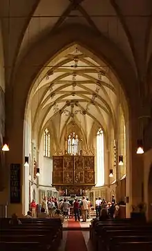 The main altar, located in the choir of St. Margaret's church, is a late Gothic winged altarpiece, dated between 1480 and 1520. Its work-day (closed) view is adorned with eight painted panels depicting the passion of Christ.[7] On the northern walls of the nave and north aisle, frescoes were discovered under layers of white paint, and partly restored.[8] In the choir, eight grave slates are on display today, one of them commemorating the pastor, poet and humanist Christian Schesaeus (1535–1585). Various wooden and painted epitaphs adorn the interior of the church. St. Margaret's church also harbours one of the largest collections of the so-called "Transylvanian" rugs, 16th–18th century Anatolian rugs in Europe.[9]