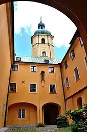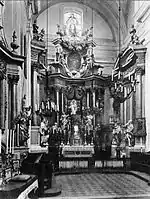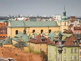 In the 17th century in the churchyard of the Augustinians' Monastery sessions of local Mazovian parliament were organised.[1] After some fires, which destroyed the church in the 15th and 17th centuries, it was converted in baroque style by Giovanni Spinola from Italy. Also at that time the church was reoriented, the main entrance was changed to Piwna Street, and the altar was moved to the south-western side (to the side of the town walls).[1] In the 17th century, a good standard orchestra was maintained by the Augustinians, which performed in the church. Inside, Adam Jarzębski was buried, a musician and composer that worked for the kings of the Vasa Dynasty.